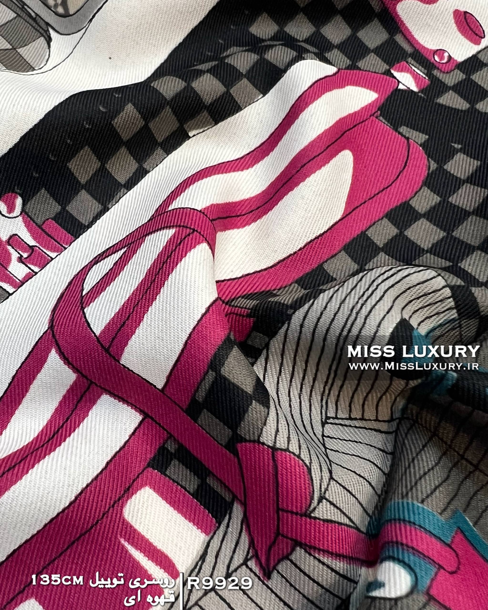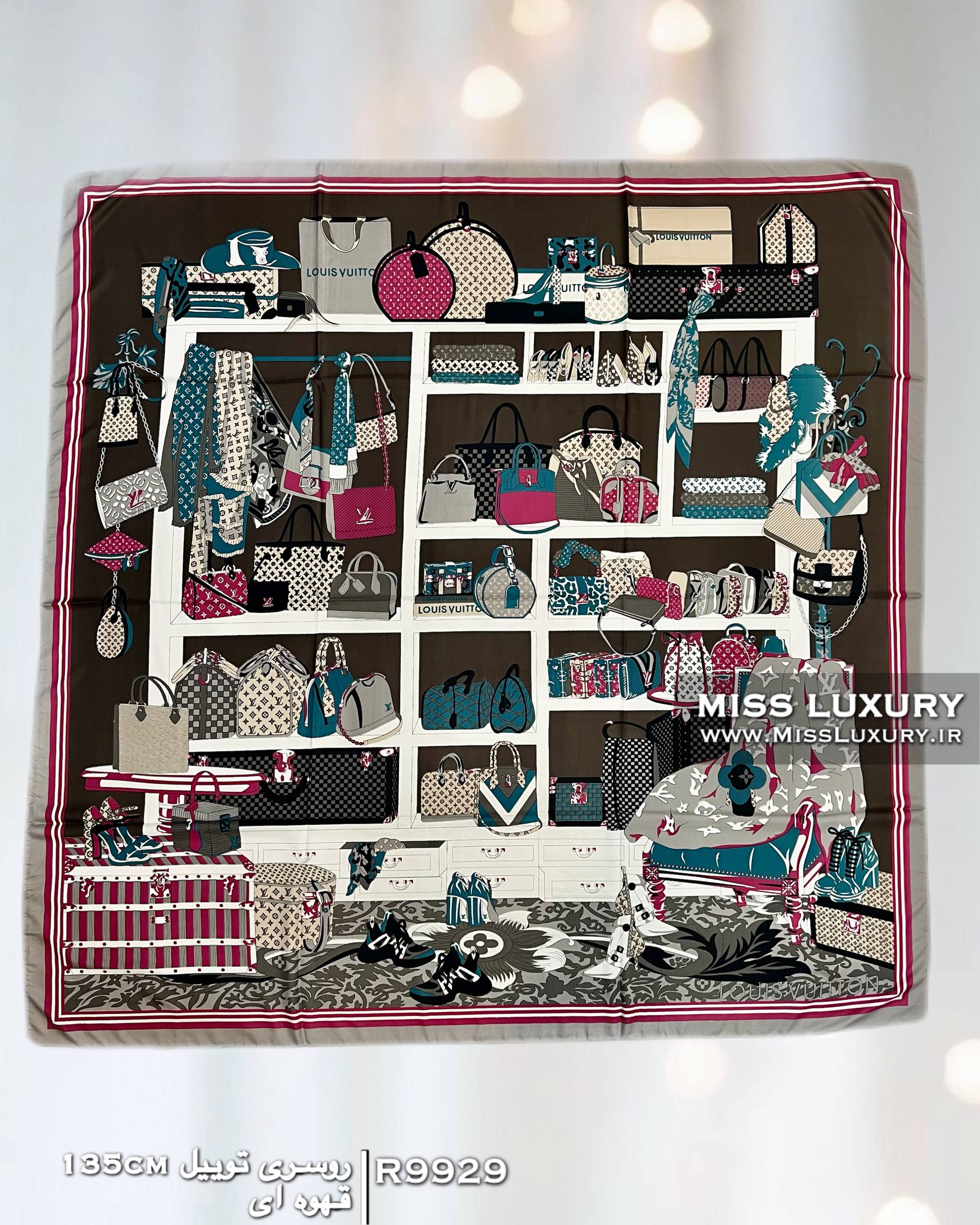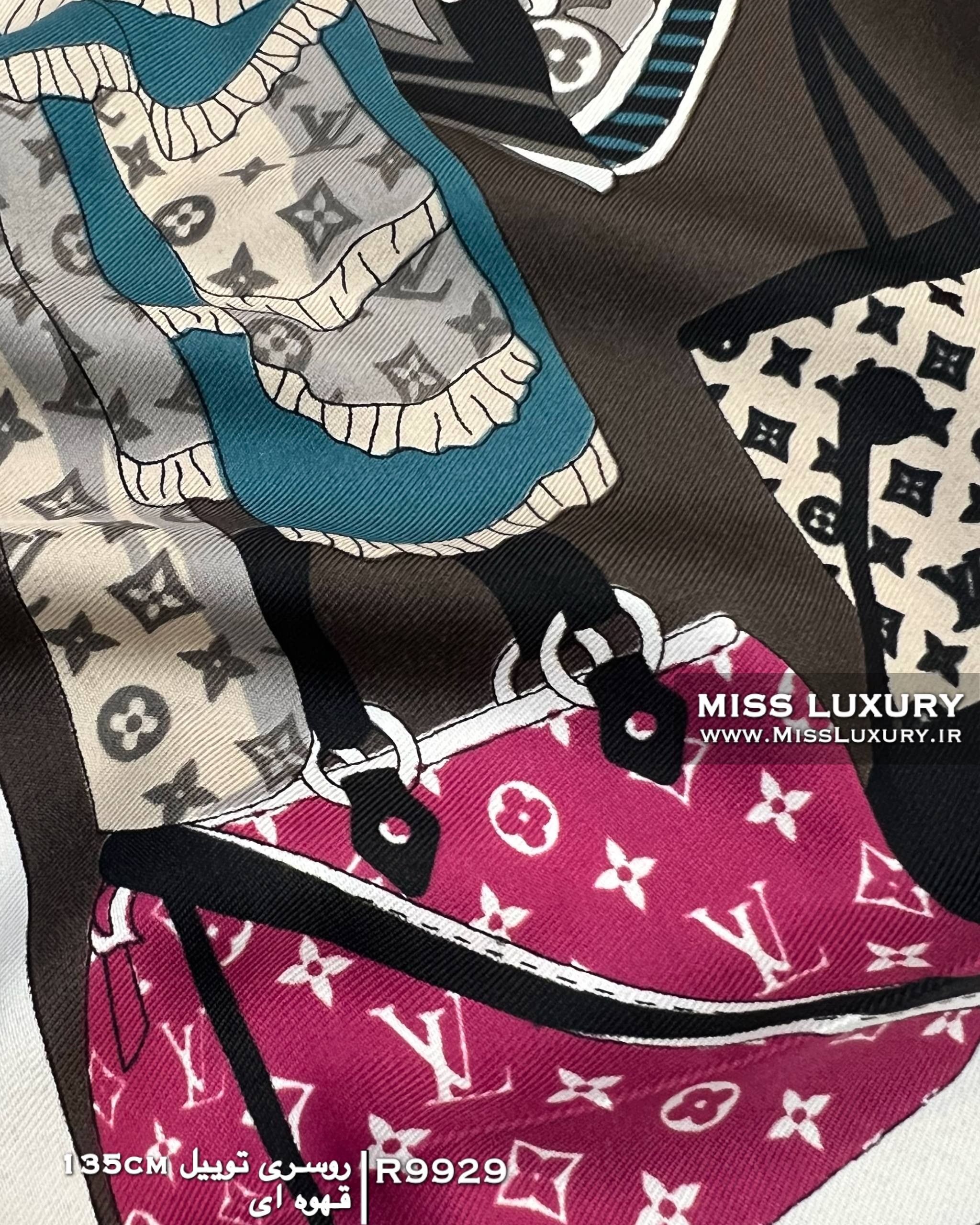 روسری توییل ابریشم قهوه ای R9929 قواره بزرگ یکی از ترندی ترین طرح های این روزها روسری ابریشم مجلسی لویی ویتون می باشد.