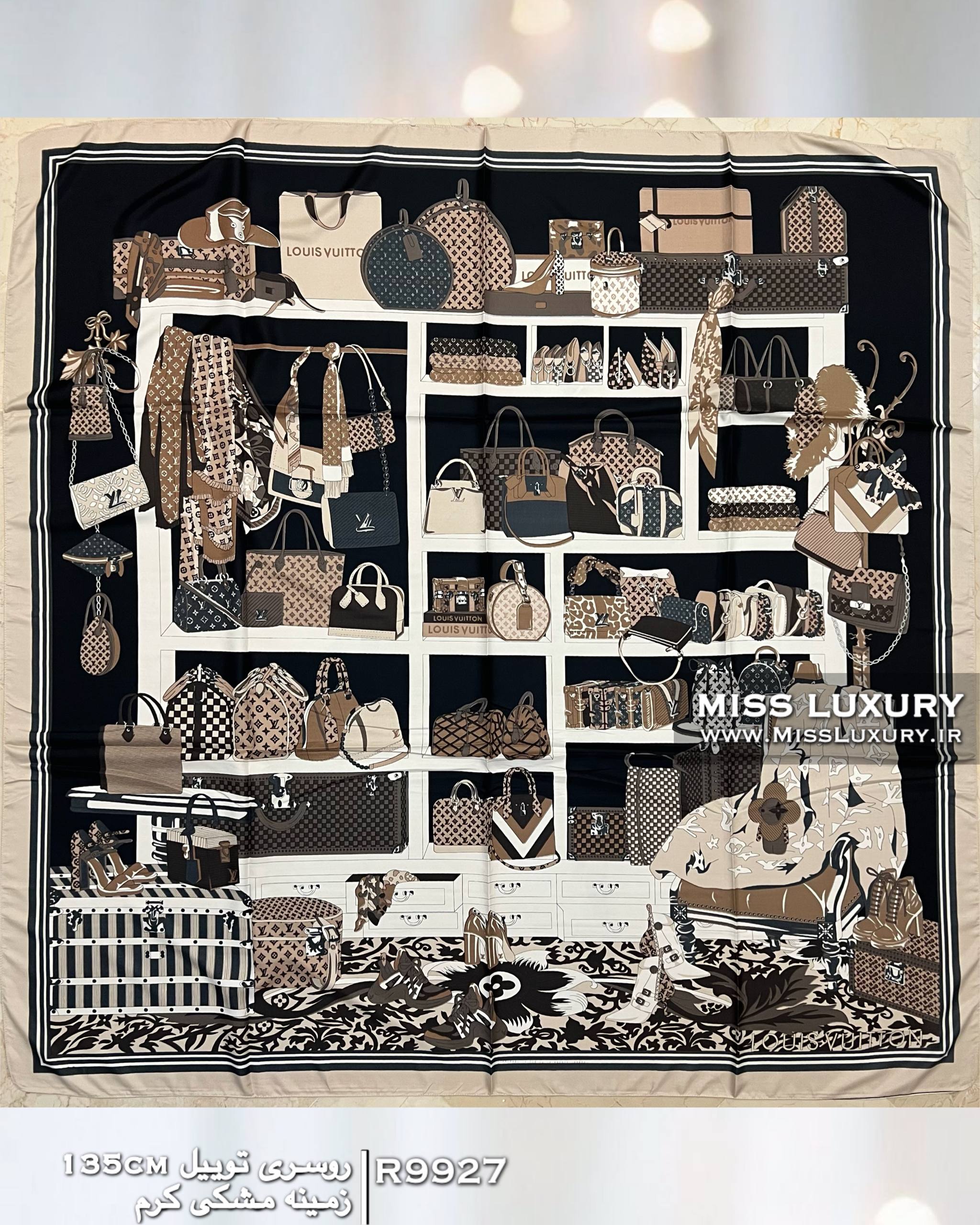 روسری توییل ابریشم مشکی کرم R9927 پشت این روسری عیدانه لویی ویتون رنگ داره و طرح این روسری مجلسی شبیه روی روسری عیدانه لویی ویتون هست.