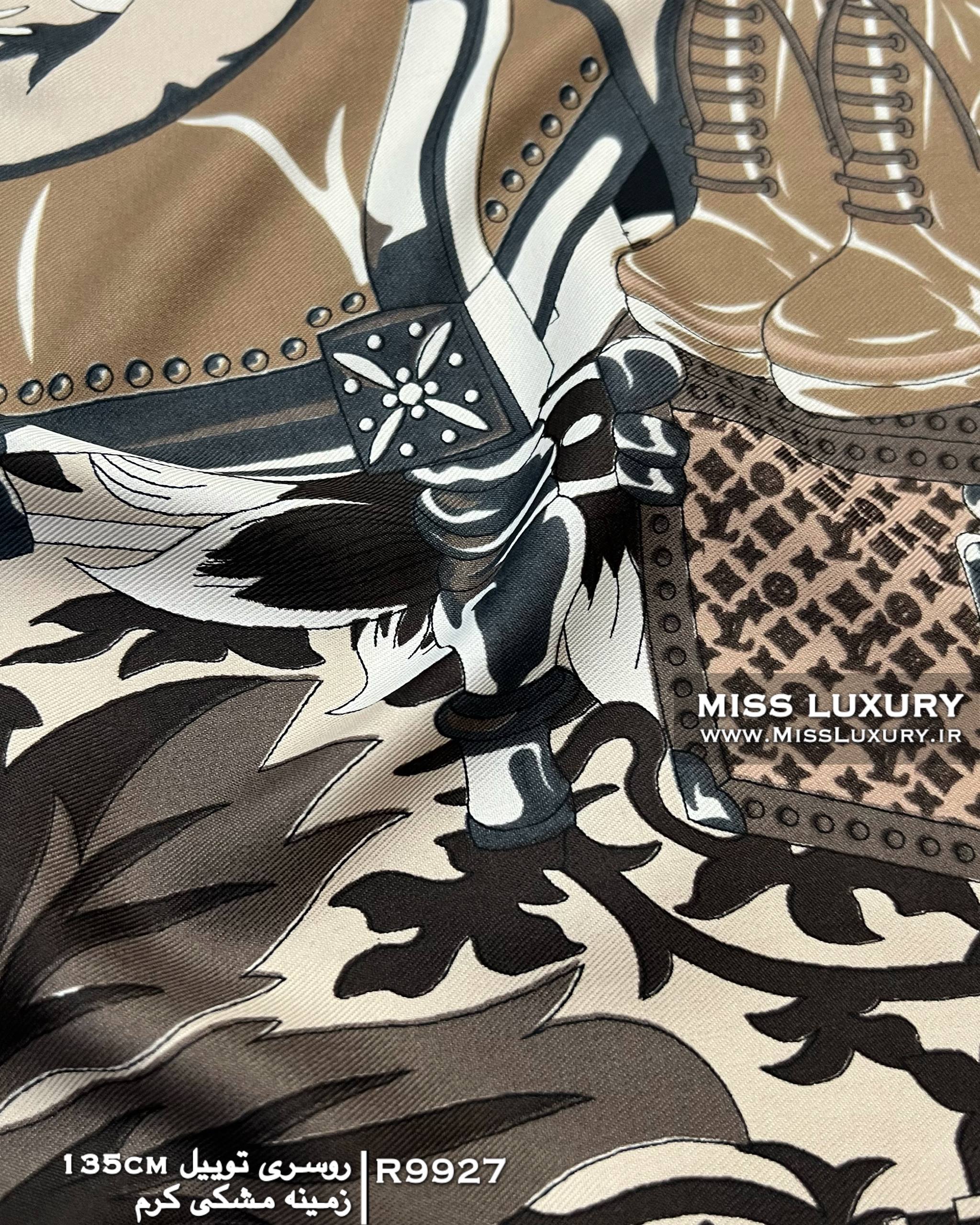 روسری توییل ابریشم مشکی کرم R9927 جلوی روسری عیدانه لویی ویتون ایستایی عالی گرد یا تیز داره و روسری برندی هست.